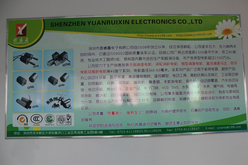 深圳市圓睿鑫電子有限公司自2008年創(chuàng)立以來,經(jīng)過誠信耕耘,在為期兩年的時間內(nèi),已通過ISO9001:2000國際質(zhì)量體系認(rèn)證。公司廠房占地面積2000多平方米,員工100人,專業(yè)技術(shù)工程師6名,擁有國內(nèi)最先進的生產(chǎn)和檢測設(shè)備,年產(chǎn)各類減速電機超過2~300萬臺。因公司發(fā)展需要,于2020年底,將生產(chǎn)基地遷往擁有最美小鎮(zhèn)之稱的東莞市清溪鎮(zhèn),依山傍水,依托美麗的大自然環(huán)境和地方文化,全新的東莞市圓睿鑫電子有限公司將借助深圳母公司平臺,一步步走上新的臺階。